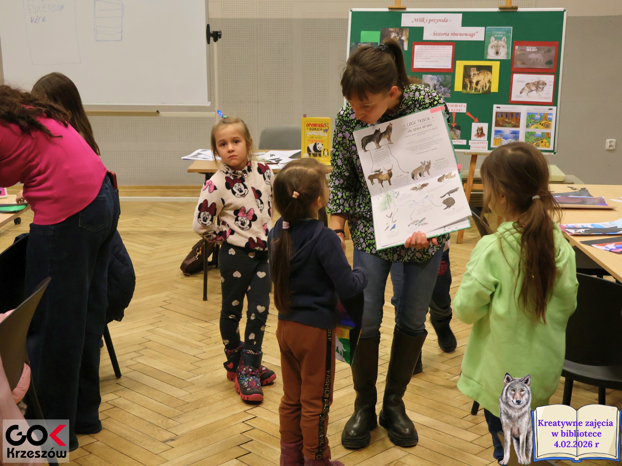 4 lutego temat zajęć kreatywnych brzmiał: „Wilk i przyroda – historia równowagi.” Naszą inspiracją do rozważań na powyższe zagadnienie stała się przepiękna opowieść o wilkach z Parku Yellowstone przedstawiona w książce Catherine Barr pt. „Czternaście wilków. O strażnikach ekosystemu”.